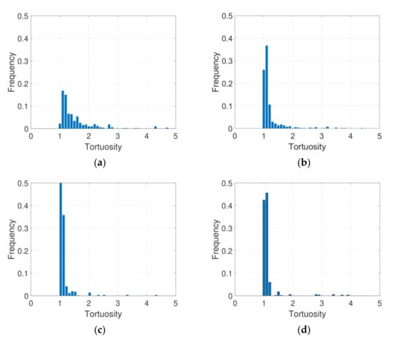 Tortuosity distribution of each specimen: (a) G33, (b) G47, (c) G60, and (d) G72.