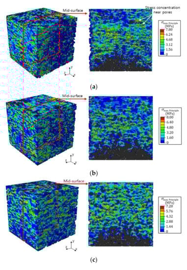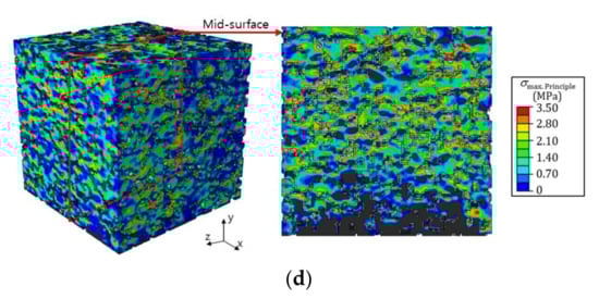 In this study, the compressive behavior of PPM specimens was numerically simulated using a finite element model that was devised using geometric information extracted by a micro-CT examination. Through a series of experimental tests, the elastic modulus, compressive strength, and plastic strain for the pervious pavement composite were determined. With the modulus, compressive strength, and plastic strain, the elastoplastic constitutive relation for the composite material considered in this work was defined and applied to the FE model. Four types of specimens were considered, and each specimen included pores throughout its material. Figure 11 displays the stress distribution of the specimens under compression loading. Here, the PPM was assumed to act as an elastic material, and the maximum principal stress was applied as the stress indicator []. These figures are presented when the stress reached the compressive strength, as determined by the experiment.