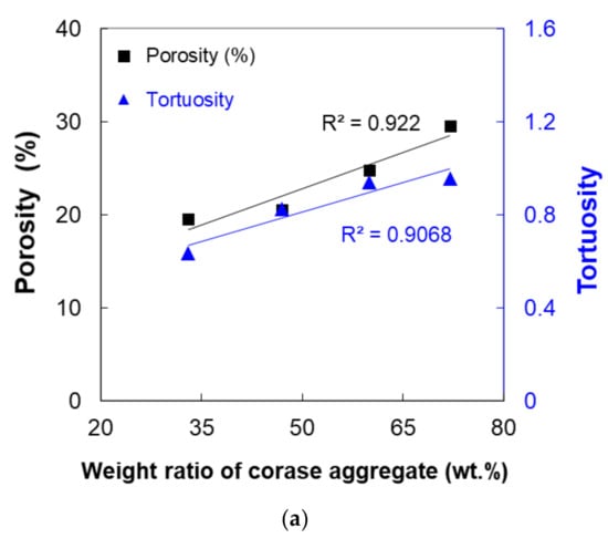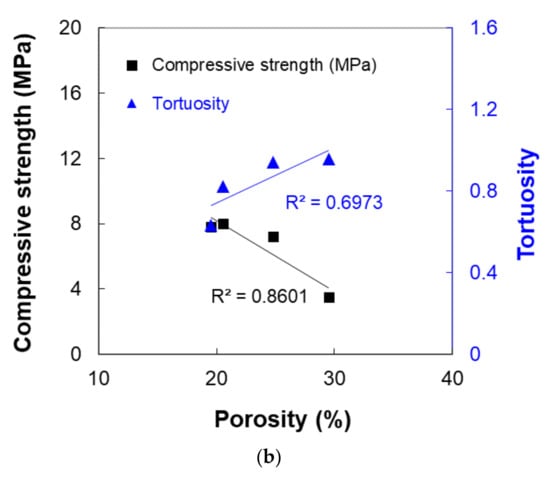 The analysis showed that the aggregate size was highly correlated with the porosity and tortuosity. As the aggregate size was increased, both the porosity and tortuosity increased linearly (Figure 12a). In addition, the result in Figure 12b indicates that the porosity in the specimen is highly correlated with the compressive strength. As in the published literature [,,], the material performance decreased as the porosity increased. The tortuosity value also increased as the porosity was increased, but there was no strong relationship (R2 = 0.69) compared to the compressive strength. This was judged as an experimental limitation due to the use of too few variables and to secure more certain experimental results regarding this aspect, additional research should be conducted in the near future. Comprehensive test results including compressive strength, porosity, and tortuosity shown in Figure 12 are also summarized in Table 4.