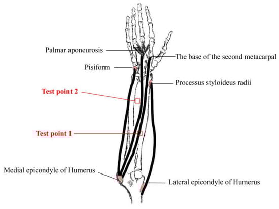 Skin microcirculation test position: Combined with the feasibility of the experiment, the selected test points should avoid superficial veins visible on the skin’s surface of the human body; the distance from the wrist was no less than 5 cm and the distance from the elbow fossa was no less than 2.5 cm. The test points with a skin area of about 1.5 cm2 were selected, while the test position and test points were the forearm of the subjects’ non-dominant hand, as shown in Figure 1.