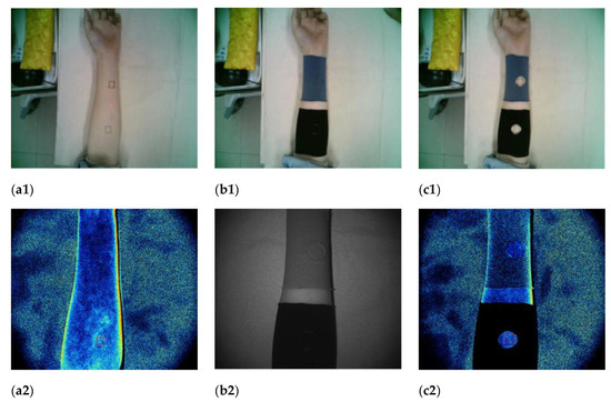 Extended forearm status and blood flow imaging of subjects’ non-dominant hand: (a1) after the forearm of the non-dominant hand of the subject is placed on the experimental platform and kept in a relatively stationary state for 15 min, test points 1 and 2 were selected for blood perfusion measurement; (b1) covered the sample for 20 min; (c1) after the covering sample were removed, test point 1 and test point 2 were selected for blood perfusion measurement; (a2) flow imaged when the sample was not covered; (b2) covered sample process; (c2) blood flow imaged after covering the sample.