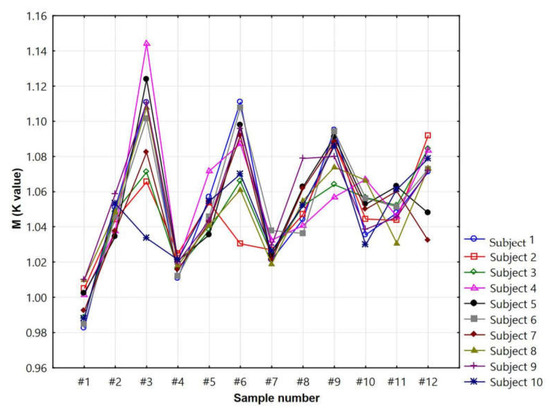In order to intuitively observe the influence of 12 pieces of seamless knitted fabric on the blood flow promotion multiples of skin–blood microcirculation in 10 healthy females, as well as the test results of the skin–blood microcirculation of the 12 pieces of seamless knitted fabric, a trend chart showing the blood flow promotion multiples of skin–blood microcirculation was made (Figure 3).