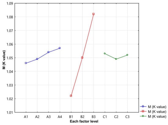 According to the results in Figure 4, in factor B, the order of blood flow promotion multiples sorted was as follows: B3 > B2 > B1, i.e., when the magnetic powder content of polypropylene was 50%, the MP fabric had a better effect on skin–blood microcirculation. When the face yarn ratio was 25:75 and the stitch was weft plain stitch, the blood flow promotion multiples of the skin–blood microcirculation was greater.