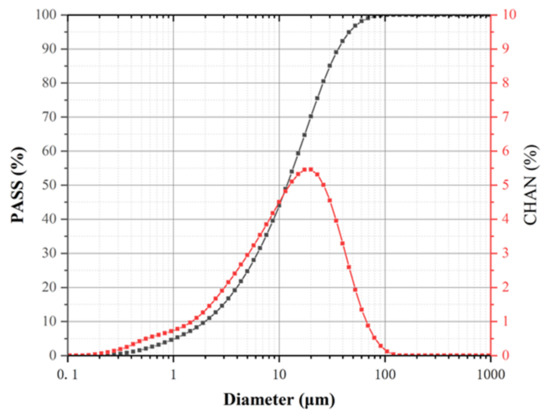 Ground granulated blast furnace slag (GGBFS) used in this paper was purchased from Wuhan SinoCem Smartec Co., Ltd., Wuhan, China, confirming to the Chinese Standard GB/T 18046-2008. Figure 1 illustrates the particle size distribution of GGBFS. Additionally, the properties of GGBFS are shown in Table 1. The alkaline activator was made from a mixture of Na2SiO3 solution (27.8% wt. SiO2, 8.8% wt. Na2O, and 63.4% wt. H2O) and solid NaOH flakes (96% purity). Additionally, Table 2 lists the properties of the graphite oxide powder (purchased from Changzhou Sixth Element Materials Technology Co., Ltd., Changzhou, China).