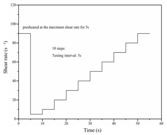 As a science of the deformation and flow of materials, rheology can describe the relationships between the stress, viscosity, and shear rate. In this study, the RM 100 touch device manufactured by Lamy Rheology Instruments (Lamy Rheology Instruments Company, Champagne-au-Mont-d’Or, France) was used to evaluate the rheological properties of the fresh pastes. The RM 100 touch device is shown in Figure 2. The temperature during the test was 25 °C and the measuring system used in this study was DIN-2. The paste was pre-sheared at 90 s−1 for 5 s, followed by a step-wise increase in shear rate from 5 to 90 s−1 in 10 steps with 5 s interval per step, as shown in Figure 3. Since the fast polycondensation reaction of alkali activated materials, the rheological behaviors of the paste were just measured at 5 min after mixing and the time-dependent behaviors were without consideration.