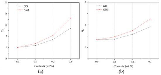 Variations between rGO and GO samples’ yield stress (a) and plastic viscosity (b).