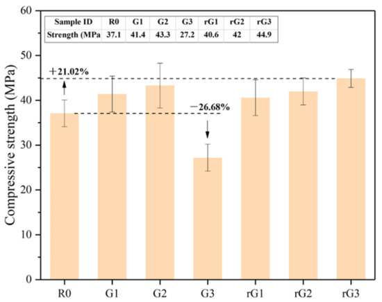 As illustrated in Figure 10, the compressive strength of G1 and G2 increased from 37.1 to 41.4 and 43.3 MPa compared to R0. However, the addition of 0.3% wt. GO nanosheets reduced the strength of the samples to 27.2 MPa, which can be attributed to the massive agglomeration of GO nanosheets in the highly alkaline matrix. Agglomerated GO nanosheets can form defects in the microstructure, facilitating the crack expansion. Previous studies [36,37,38,39] have also reported similar experimental results that GO nanosheets can be agglomerated in an alkaline solution. It should be noted that the agglomeration of GO nanosheets cannot be detected in the rheological test, indicating that GO nanosheets may begin to agglomerate on a large scale only after the matrix had undergone a certain degree of the polycondensation reaction. In addition, the reinforcing effect of GO nanosheets was more obvious than rGO nanosheets when the content was less than 0.2% wt., owing to the more oxygen-containing groups and less structural defects of GO nanosheets.