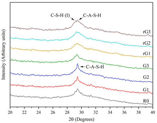 The XRD patterns of the samples are determined to identify the microscopic products of the alkali activated materials with rGO/GO addition, as shown in Figure 11. The patterns reported that the GO/rGO-reinforced alkali activated materials have two crystalline hydration products. These results indicated that the chemical composition of the alkali activated materials was not changed with GO/GO addition but changed the hydration process. The peak at 2θ = 29.27° was C-A-S-H phase (PDF #00-033-0306), and the crystalline C-S-H (I) (C-S-H with low Ca/Si ratio, PDF #00-034-0002) was detected for the samples with rGO addition, which featured a high content of Si present as a Si-rich hydrate. Additionally, the XRD patterns of rGO/GO-reinforced alkali activated materials are similar to the previous research done by Long et al. [18].