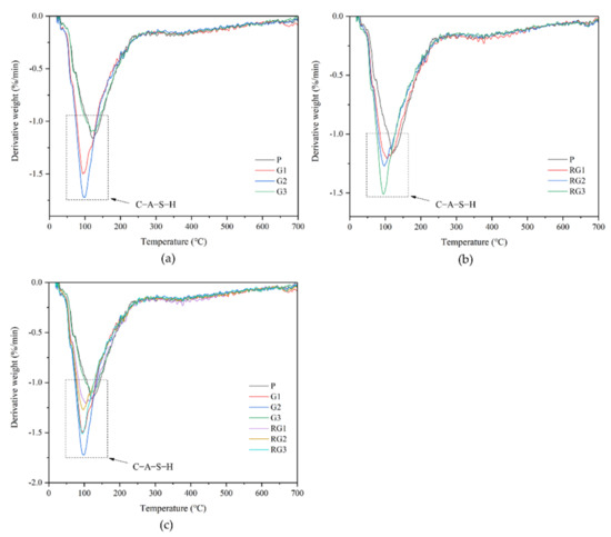DTG results of the alkali activated materials with GO/rGO addition are depicted in Figure 12. The figure reveals that the main mass loss is in the temperature range of 50–200 °C of the samples related to the C-A-S-H gels [40,41]. However, the dehydration peak of C-S-H (I) was not obvious in the DTG analysis, likely due to the amorphous structure of C-S-H (I).