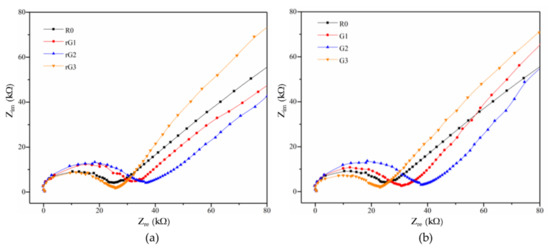 Nyquist curves of the samples with rGO (a) and GO (b) addition.