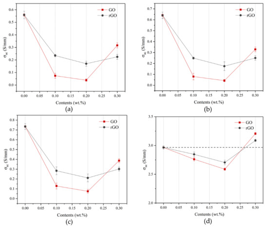 Electrical conductivity of the samples with GO and rGO: (a) 20 Hz; (b) 100 Hz; (c) 1000 Hz; (d) 100,000 Hz.