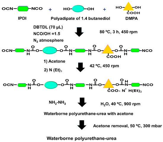 Different reactants were used for synthesizing the waterborne poly(urethane urea) dispersions (PUDs). Dried polyadipate of 1,4-butanediol with molecular weight of 2000 Da—Hoopol F-501 (Synthesia, Barcelona, Spain)—was used as polyol. Isophorone diisocyanate (IPDI, 98 wt.% purity) was used. As internal emulsifier, 2,2 bis(hydroxymethyl) propionic acid (DMPA, 98 wt.% purity) was used, triethylamine (TEA, 99 wt.% purity) was used as neutralization agent, monohydrated hydrazine (HZ, 60 wt.% purity) was used as chain extender, and dibutyltindilaurate (DBTDL, 95 wt.% purity) was used as catalyst—all were supplied by Sigma Aldrich (Barcelona, Spain). Acetone (99.5 wt.% purity)—Sigma Aldrich, St. Louis, MO, USA—and de-ionized water were used.