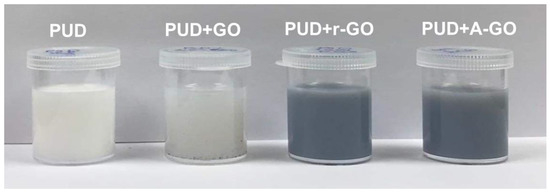 Figure 2 shows the appearance of the PUDs after one month of their syntheses. The color of PUD+A-GO and PUD+r-GO are darker than that of PUD+GO.