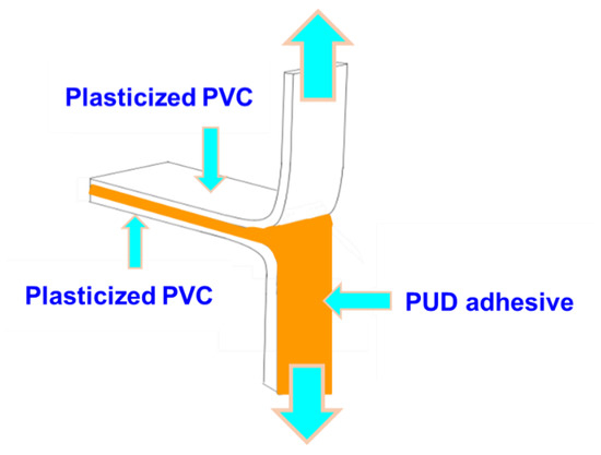 Scheme of the T-peel test of plasticized PVC/PUD adhesive/plasticized PVC joints.