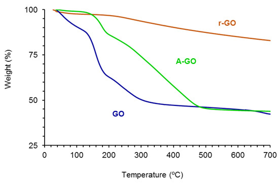 The amounts of functional groups of GO, A-GO and r-GO were assessed by TGA. Figure 4 shows the variation of the weight as a function of the temperature of the GO derivatives. The amounts of functional groups are high and somewhat similar in GO (61 wt.%) and A-GO (56 wt.%), but r-GO shows only 18 wt.% functional groups. The nature of the functional groups in the GO derivatives was assessed from the derivative thermal gravimetric analysis plots (Figure S3 of the Supplementary Materials file). GO shows the thermal decompositions due to absorbed moisture (49 °C), -C-OH (158, 231–257 °C), and –O-C=O (676–688 °C) groups—Table 3, whereas A-GO shows the thermal decompositions of absorbed moisture (50 °C), -C-N (177 °C), -C-OH (263 °C), and C=O (361, 438 °C) groups. On the other hand, r-GO shows two thermal decompositions due to absorbed moisture (54 °C) and -C-OH groups (258 °C). The thermal decomposition of the C-OH groups appears at about 257–258 °C in all graphene oxide derivatives, but in GO some additional thermal decompositions at 158 and 231 °C of the C-OH groups also appear, indicating different interactions with the graphene sheets. Therefore, GO shows the highest percentage of -C-OH groups and A-GO shows the highest percentage of C=O groups; furthermore, A-GO contains 18 wt.% C-N groups due to the treatment of GO with dodecyl amine, in agreement with the findings of Wang et al. [28].