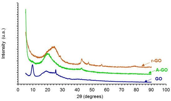 The X-ray diffractograms of the graphene oxide derivatives (GO, A-GO, r-GO) are shown in Figure 5. GO shows three main diffraction peaks at 2Ɵ values of 9.55, 18.30, and 25.35°, the one at 9.55° is characteristic of GO [29]. The peak at 2Ɵ value of 9.55° is associated to the (101) diffraction plane due to the formation of oxygen-containing groups in GO which causes an expansion of the C–C interplanar spacing of the graphite, and the two peaks at 2Ɵ values of 18.30 and 25.35° are associated to the oxidation of graphite [29,30]. On the other hand, the X-ray diffractogram of r-GO shows the varnishing of the peak at 2Ɵ value of 9.55° caused by the dismantle of the regular stacking of the GO sheets and the aggregation of the graphene sheets, the broad weak peak at 2Ɵ value of 20.75° is retained, indicating parallel stacking of the r-GO sheets [29]. Furthermore, the reduction of the GO removes the most oxygen containing groups in the interstitial graphitic spaces and restores the C–C lattice of the graphite and, therefore, the diffractogram of r-GO shows some peaks of graphite at 2Ɵ values of 42.9°—(101) plane -, 47.55°—(102) plane -, 56.55°—(004) plane -, and 77.1°—(110) plane [31]. The amine-functionalization of the GO also shows the varnishing of the peak at 2Ɵ value of 9.55° caused by the dismantle of the regular stacking of the GO sheets and the broad weak peak at 2Ɵ value of 19.15° is retained, indicating parallel stacking of the A-GO sheets; in addition, some aggregation of the graphene sheets in A-GO is evidenced by the diffraction peak at 2Ɵ value of 42.9° due to the (101) plane of the graphite [30].