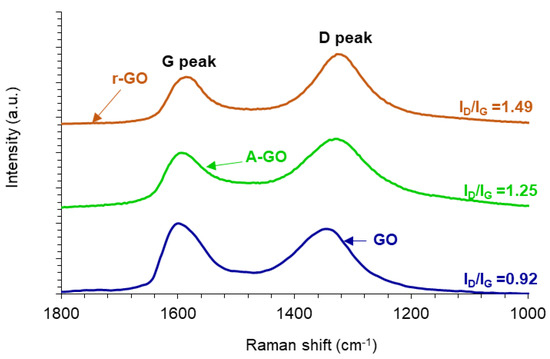 The structural changes produced during the reduction and amine-functionalization of GO are evidenced in the Raman spectra (Figure 6). All Raman spectra show the D band at 1342 cm−1 related to the disordered structure of GO, and the G band at 1598 cm−1 related to C-C bond of sp2 carbon. The ratio of the intensities of the D and G bands (ID/IG) is related to the order of graphene nano-sheets, i.e., the increase of the ID/IG ratio indicates a decrease of the average size of the C-C sp2 nano-sheets. The ID/IG ratios in the Raman spectra of r-GO and A-GO are higher than in GO due to the presence of unrepaired defects after the removal of oxygen-containing functional groups. Thus, GO has the highest average size of the C-C sp2 nano-sheets whereas r-GO has the lowest. It is worthy to note that these ID/IG ratios are consistent with the values in the literature [32,33].