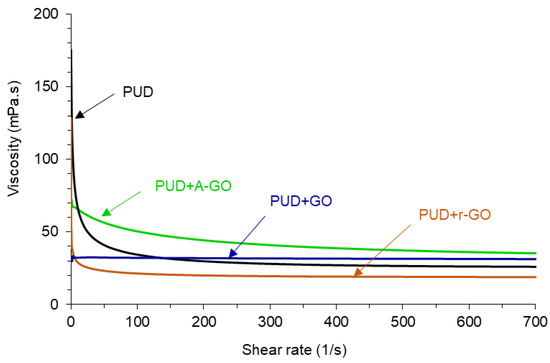 The variation of the viscosity at 25 °C as a function of the shear rate for the PUDs without and with 0.04 wt.% GO derivatives is shown in Figure 8. In general, at low shear rate, the viscosities of the PUDs differ significantly, but at high shear rate they are less different (19–34 mPa.s), this indicates the existence of non-Newtonian rheological behavior—shear thinning. The PUD without GO derivative shows the most noticeable shear thinning and the viscosity at a shear rate of 700 s−1 is 25 mPa.s. The addition of the GO derivative reduces the shear thinning in a different extent depending on its functional chemistry, only PUD+GO shows a Newtonian rheological behavior. Whereas PUD+A-GO shows some shear thinning and higher viscosity than PUD (34 mPa.s at a shear rate of 700 s−1), PU+r-GO exhibits more noticeable shear thinning but lower viscosity (19 mPa.s at a shear rate of 700 s−1). Because the extent of the shear thinning in the PUDs can be ascribed to the decrease of the ionic interactions between the particles, more net interactions between GO and the polyurethane chains are produced, likely due to the higher number of surface functional groups on this graphene oxide derivative.