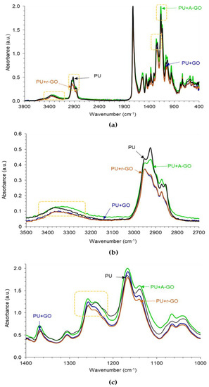 (a) ATR-IR spectra of the PUs without and with GO derivatives; (b) 3500–2700 cm−1 region, and (c). 1400–1000 cm−1 region of the ATR-IR spectra.