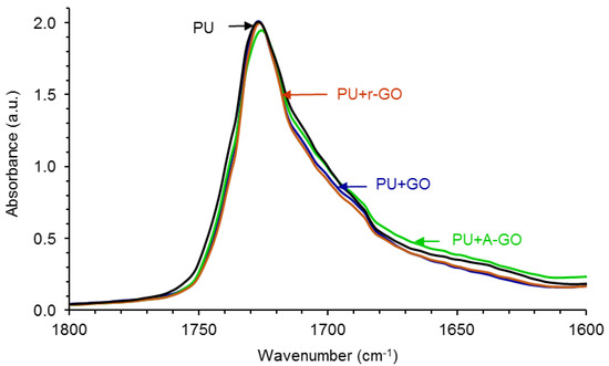 Figure 10 shows the carbonyl region (1800–1600 cm−1) of the ATR-IR spectra of the PUs in which differences in the regions of the associated by hydrogen bond (H-bonded) urethane and urea groups are noticed. In order to quantify these differences, the curve fitting of the carbonyl region of the ATR-IR spectra of the PUs have been carried out. Figure S4 of the Supplementary Materials file shows, as typical example, the curve fitting of the carbonyl region of the PU without GO derivative in which four contributions due to the free urethane, H-bonded urethane, free urea, and H-bonded urea species can be distinguished.