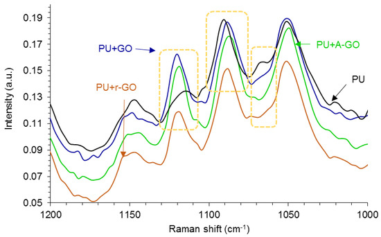 1200–1000 cm−1 region of the Raman spectra of the PUs without and with GO derivatives.