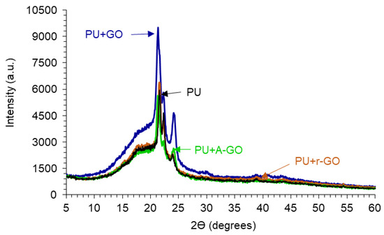 The crystallinity of the PUs is due to the interactions between the hard and the soft segments, as assessed by X-ray diffraction. Figure 12 shows the X-ray diffractograms of the PUs in which three diffraction peaks at 2Ɵ values of 21.30–21.65, 22.20–22.35, and 23.75–24.10° can be distinguished, they are somewhat similar irrespective of the functional groups on the GO derivatives. The diffraction peaks at 2Ɵ values of 18.3–20.75° of the GO derivatives do not appear in the X-ray diffractograms of the PUs because of its adequate dispersion and low amount added. On the other hand, the intensities of the diffraction peaks are similar in all PUs, except in PU+GO in which more noticeable interactions between the hard and the soft segments are produced, likely caused by more net GO-poly(urethane urea) chains interactions.