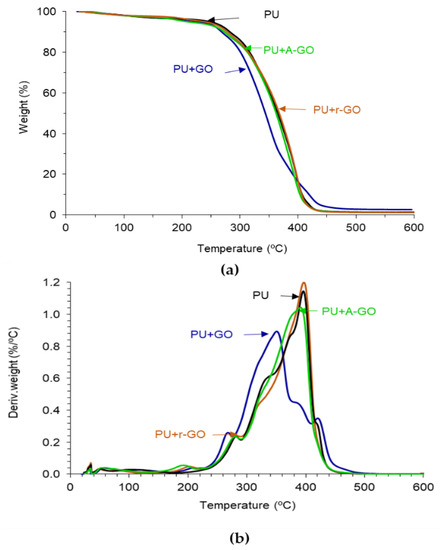 The thermal stability and structure of the PUs were assessed by TGA. Figure 13a shows the variation of the weight as a function of the temperature of the PUs. PU+GO shows lower thermal stability than PU and the other PU+GO derivatives, likely due to more noticeable structural changes. The thermal stabilities of the PUs were quantified by the temperatures at which 5 (T5%) and 50 (T50%) wt.% are lost. According to Table 8, the addition of all GO derivatives decreases the value of T5%, due to the interactions between the hard and soft domains caused by the intercalation of the graphene nano-sheets. The lowest value of T5% corresponds to PU+A-GO, as the soft segment content is higher than in the rest. On the other hand, the value of T50% is similar in all PUs, except in PU+GO which is lower. Some literature has established the improved thermal stability of the polyurethane composites containing graphene derivatives [17,34,35], but the opposite trend is found in this study, this can be due to the small amount added of the GO derivatives and to the dominant effect of the GO derivative morphology of the nano-sheets in changing the structure of the hard and soft domains. Thus, the thermal stability of the PU is differently affected by adding GO derivatives with different functional groups.