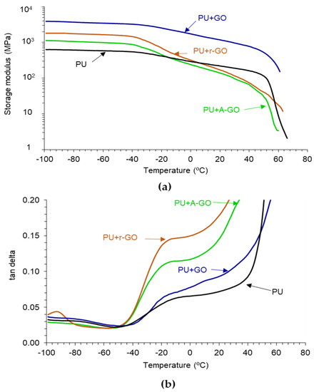 The viscoelastic properties of the PUs have been assessed by DMA. Figure 14a indicates that all PUs show the glassy, glass transition, rubbery plateau, and melting regions. In the glassy region, the storage modulus of the PU increases by adding 0.04 wt.% GO derivatives, more noticeably in PU+GO and less markedly in PU+A-GO, which has higher percentage of soft segments. The glass transition and the rubbery plateau regions become steeper in the PUs with GO derivatives, except in PU+GO, and the melting is produced at a lower temperature. Therefore, the viscoelastic properties of the PUs are modified by adding GO derivatives and differently for PU+GO than for PU+A-GO and PU+r-GO. The viscoelastic behavior of PU+GO is somewhat similar to that of the PU without GO derivative, but the values of the storage moduli are higher due to the covalently bonded GO nano-sheets to the polymer chains. However, r-GO and, mainly, A-GO interact less effectively than GO with the polymer chains and disturb the interactions between the poly(urethane urea) chains leading to steeper glass transition and rubbery plateau regions.