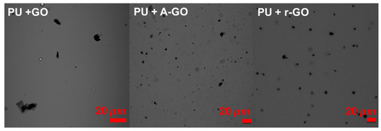 The dispersion of the GO derivatives particles in the poly(urethane urea) matrix in the PUs was assessed by confocal laser microscopy (Figure 15). All GO derivatives are well dispersed into the PU matrix, the r-GO and A-GO particles have similar size (4–8 µm) and they do not agglomerate. However, most GO particles cannot be distinguished in PU+GO but some agglomerates of nano-sheets can be noticed.