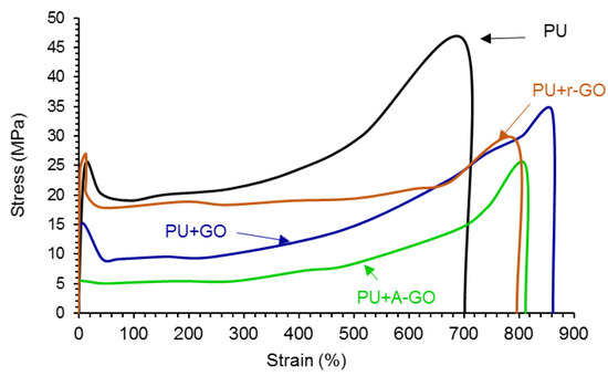 The addition of the GO derivatives also affects the mechanical properties of the PUs which were assessed by stress-strain tests. According to Figure 16, all stress-strain curves show a noticeable yield point (less marked in PU+A-GO) followed by the plastic deformation until the PU breaks. The addition of the GO derivatives increases the elongation-at-break (Table 11) and decreases the tensile strength and the yield stress of the PU. PU+GO shows higher elongation-at-break and tensile strength values than PU+r-GO and PU+A-GO. This trend agrees with the better viscoelastic properties and degree of micro-phase separation of PU+GO with respect to PU+r-GO and PU+A-GO. Furthermore, PU+r-GO shows similar yield stress to PU (Table 11) because of larger and thicker nano-sheets of r-GO which may cause fewer net interactions with the polymer chains. Therefore, the addition of the GO derivatives seems to impart some toughening to the PU, to a different extent depending on the size of the nano-sheets and the functional groups of the GO derivatives.