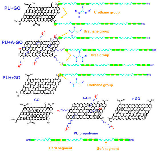 Scheme of the covalent linkages between the functional groups on the GO derivatives surfaces and the end NCO groups of the prepolymer produced during PUD synthesis.