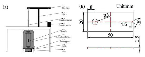 Schematic diagram of thermal fatigue equipment and sample size: (a) schematic diagram of thermal fatigue testing machine; (b) dimensions of thermal fatigue specimens.