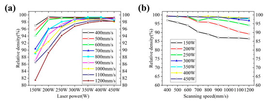 Effect of process parameters on density: (a) effect of laser power on density; (b) effect of scanning speed on density.
