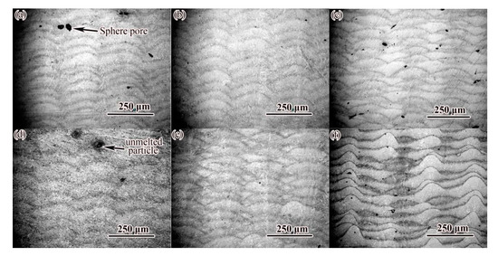 OM image of cross section of alloy steel formed by SLM at different laser power: (a) P = 200 W; (b) P = 250 W; (c) P = 300 W; (d) P = 350 W; (e) P = 400 W; (f) P = 450 W.