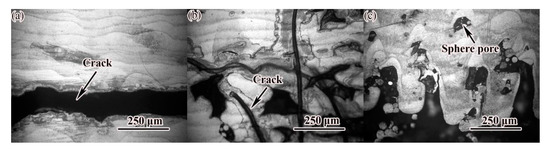 Types of defects at low laser power: (a) P = 150 W; V = 700 mm/s; (b) P = 150 W; V = 700 mm/s; (c) P = 150 W; V = 700 mm/s.