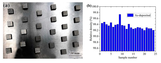 In the first orthogonal test, the samples under different laser processes showed defects such as spheroidization, pores and cracks, as shown in Figure 7. The main reasons for the formation of cracks were analyzed: at medium scanning speed and low laser power, the amount of powder melted by laser energy was insufficient, resulting in poor stability of the molten pool, and the unstable molten pool was entrained in the surrounding metal powder. In the final solidification area, it was easy to form enriched oxides or inclusions, and finally cracks were formed under the action of stress. In the first orthogonal test, because the sample still had spherical pores and other defects, the optimization test was used to optimize the process parameters again, and the macroscopic morphology of the sample is shown in Figure 8a. Figure 8b shows the results of the sample density test. Obviously, the density of No. 9 sample was the highest, reaching 99.78%. After comprehensively considering other indicators such as microstructure and density, the optimal process parameters were determined as follows: laser power 300 W, scanning speed 530 mm/s, scanning spacing d = 0.11 mm, fixed layer thickness h = 50 μm.