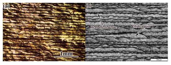Under the optimized process parameters, 24CrNiMo alloy steel samples were prepared by SLM technology. The surface morphology and low-power optical microstructure of the samples are shown in Figure 9. The tensile strength and yield strength of the deposited sample reached 1199 MPa and 1053 MPa, respectively; the elongation after fracture was 10.8%, and the hardness was 365~388 HV0.2. Compared with the test results of other groups, the surface of the SLM formed sample under this process parameter was smooth and well formed, the microstructure was basically free of defects, such as pores, and the density was higher under this process parameter. Therefore, the optimized process parameters obtained in the experiment were reasonable.