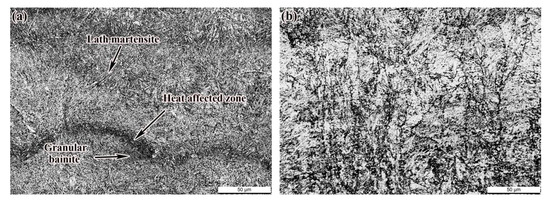 As shown in Figure 10a, due to the forming characteristics of SLM, the martensite structure was easily formed in the alloy steel in the molten pool area. Under the reheating action of the subsequent cladding layer, the martensite was tempered to a certain extent. Due to the technological characteristics of SLM layer-by-layer stacking, the formed martensite in the molten pool changed differently with the distance from the new molten pool during the laser scanning in the next layer. The nearest structure was remelted to become part of the new molten pool. The area where the phase transition occurred when it was not melted and heated above the austenitizing temperature was the heat-affected zone, which became the dividing line between the new molten pool and the old molten pool. The structure of the old molten pool was tempered. The closer the structure was to the new molten pool, the higher the tempering temperature and the longer the tempering time and forming of lath martensite. The molten pool area near the bottom of the new cladding layer was obviously affected by heat, being heated to a higher temperature and undergoing continuous rapid cooling and solidification, and finally granular bainite was formed. Figure 10b shows the microstructure of the SR sample, which shows that the microstructure of the sample had no obvious change (500×) compared with the deposited state after SR.