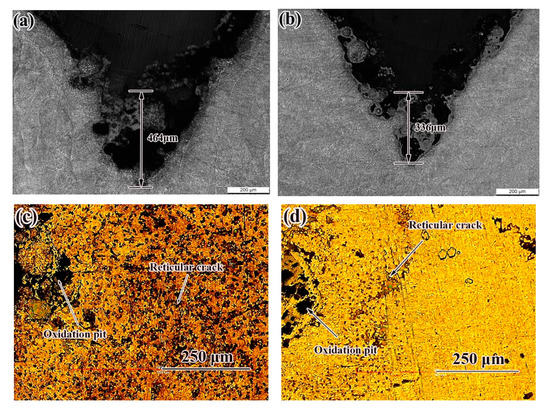 Crack morphology of samples in different states after thermal fatigue test: (a,c) as-deposited; (b,d) SR.