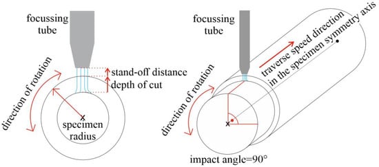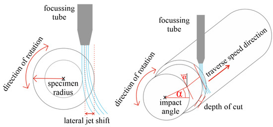 Compared to AWJ cutting, several new variables were defined. They are related to the relative position of the jet and specimen and to the rotational movement. These new variables are the direction of rotation, the rotational speed, the lateral jet shift, and the radius of the specimen. The theoretical influence of the new variables, as well as some already well examined variables, will be discussed below.