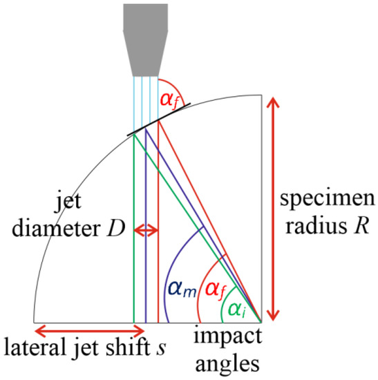 As the jet itself has a diameter, a single angle of impact is not defined, but a set of them. This angle of impact also depends on the diameter of the specimen. The bigger the sample diameter, the lower the set of impact angles for a selected shift. We can define three impact angles based on the diameter of the specimen and the relative position of the focusing tube (