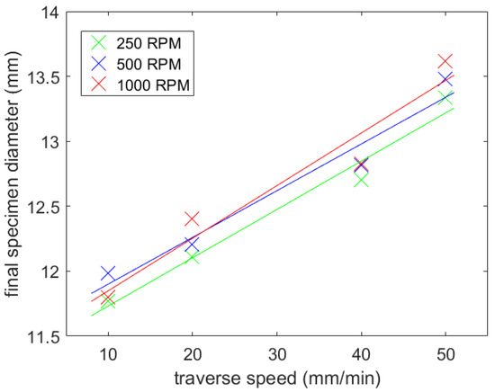 Figure 7. However, it is obvious that the impact of the rotational speed of the specimen on the material volume removed was low. This may have been caused by the type of material selected. It is generally harder to observe slightly changed conditions in high strength materials, such as steel. Since several lateral shifts were performed, we still lacked information about how much material was eroded during each jet shift.