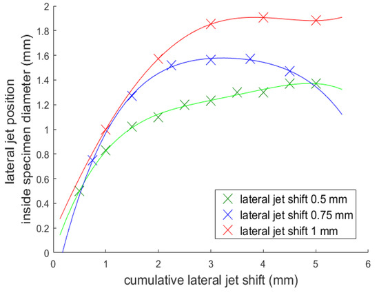 Figure 9 and is caused by the round shape of the specimen. This trend was most visible for the 0.5 mm lateral jet shift. It seems that with this setup, the material removal was almost ideal compared to the other lateral jet shifts.