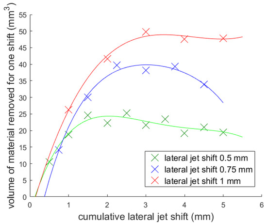 JP on the cumulative lateral jet shifts into the material and the dependence of the volume of the material removed on the lateral jet shifts are shown in