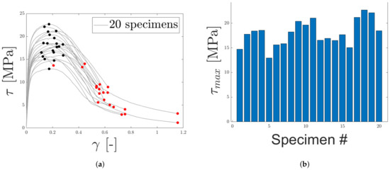 In Figure 15a, the stress–strain responses of 20 specimens, subjected to shearing, are presented. The variety of the response was evident, with the highest peak stress being larger than the lowest peak force by a factor close to two, see Figure 15b. Peak stresses and maximum strains are marked with black and red markers, respectively, in the Figure 15a. The response presented in Figure 15a is clearly more ductile than LC 1. Commonly, after the specimen has reached its peak stress, damage in the core region grows, reducing the load resistance capacity until a total failure occurs. Due to the ductile response, the core is able to bear load well beyond the peak stress, a major difference between LC 1 and 3. The equivalent shear modulus, determined in a similar manner as the equivalent Young’s modulus for LC 1, exhibited a wide spread, see Figure 15c.
