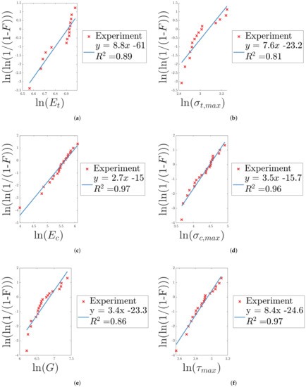 which equals the square of the standard deviation. To fit the Weibull distribution against experimental data, Equation (2) was subjected to a double logarithmic transformation, resulting in