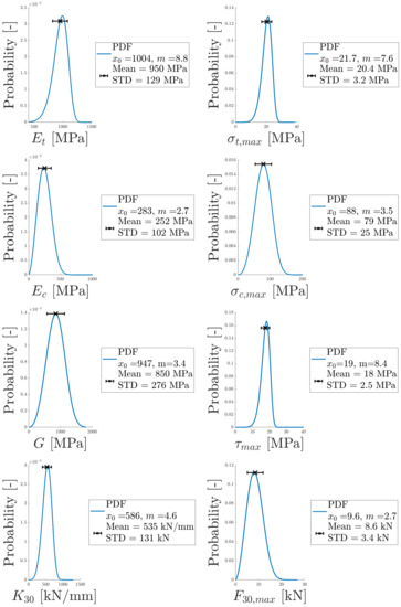 In this section the results presented in Section 4.1 are analyzed using statistical methods, in accordance with Section 3. In particular, a two-parameter Weibull distribution was fitted against the parameters presented in Table 4. For each parameter at least 15 test specimens (observations) were used.
