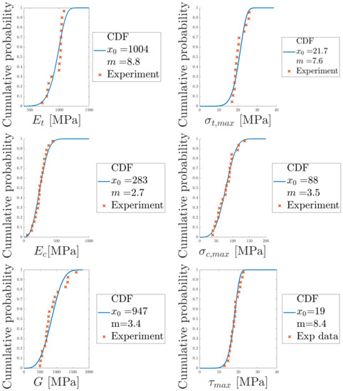 Cumulative density functions, obtained from the determined Weibull parameters, are presented for each parameter in Table 4.