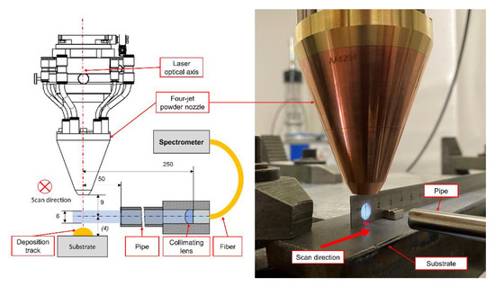 Data acquisition was performed with the use of an UV-Vis spectrometer (OCEAN-HDX-UV-VIS, Ocean Insight, Orlando, FL, USA) with a spectral measurement range from 200 to 800 nm. The resolution at FWHM is 0.73 nm using a 10 µm entry slit. For efficient light collection, a fused silica collimation lens was attached horizontally to the processing head and aligned to the optical centre line of the laser beam. A pipe with 6 mm inner diameter and a blackened inner cylinder was attached to the collimation lens to reduce the impact of scattered radiation. The distance between the collimation lens and the optical axis of the laser was set to 250 mm. Cladding was performed at an orthogonal orientation of the collimation lens with respect to the processing direction. The lower edge of the collimation beam was set at a distance of 1 mm above the substrate surface. Figure 2 shows the measurement setup and collimation lens alignment. Coupling of the lens to the spectrometer was achieved by a multi-mode fibre with a core diameter of 100 µm.