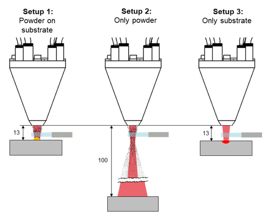 In setup 1, the powder nozzle had a working distance of 13 mm above the substrate surface and the powder material was fed according to the parameter sets listed in Table 1. In setup 2, the working distance was increased to 100 mm above the substrate surface, and the powder material was fed according to the given parameter sets. Thus, no track was placed, and the substrate surface was heated by the expanded laser beam. In setup 3, the powder feed rate was set to 0 g/min, but the carrying gas flow remained at 10 L/min and the working distance remained at 13 mm. Hence, merely the substrate material is remelted. The position of the collimation lens remained constant for all setups. For each combination of experimental setup and parameter set, one experiment was performed.
